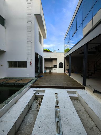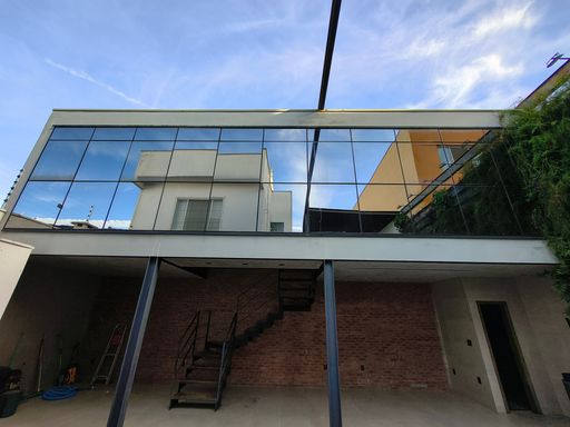 Nos fundos, o imóvel conta ainda com uma casa auxiliar independente, toda em painéis de vidro espelhado, composta por: