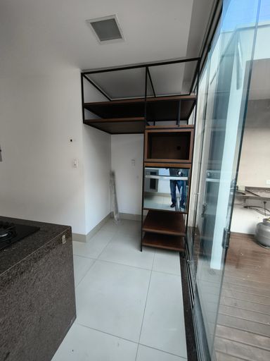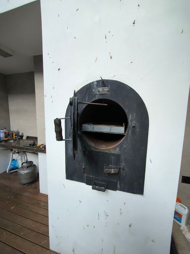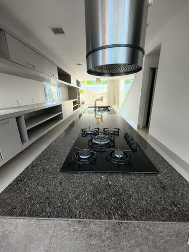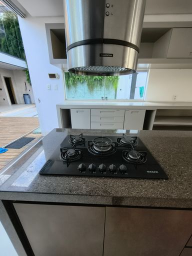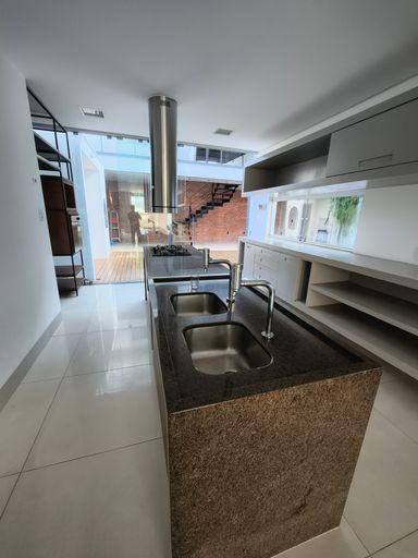 Ao fundo da cozinha, uma área gourmet coberta convida a momentos especiais, equipada com forno refratário profissional e churrasqueira a carvão, ideal para quem aprecia gastronomia e receber bem.